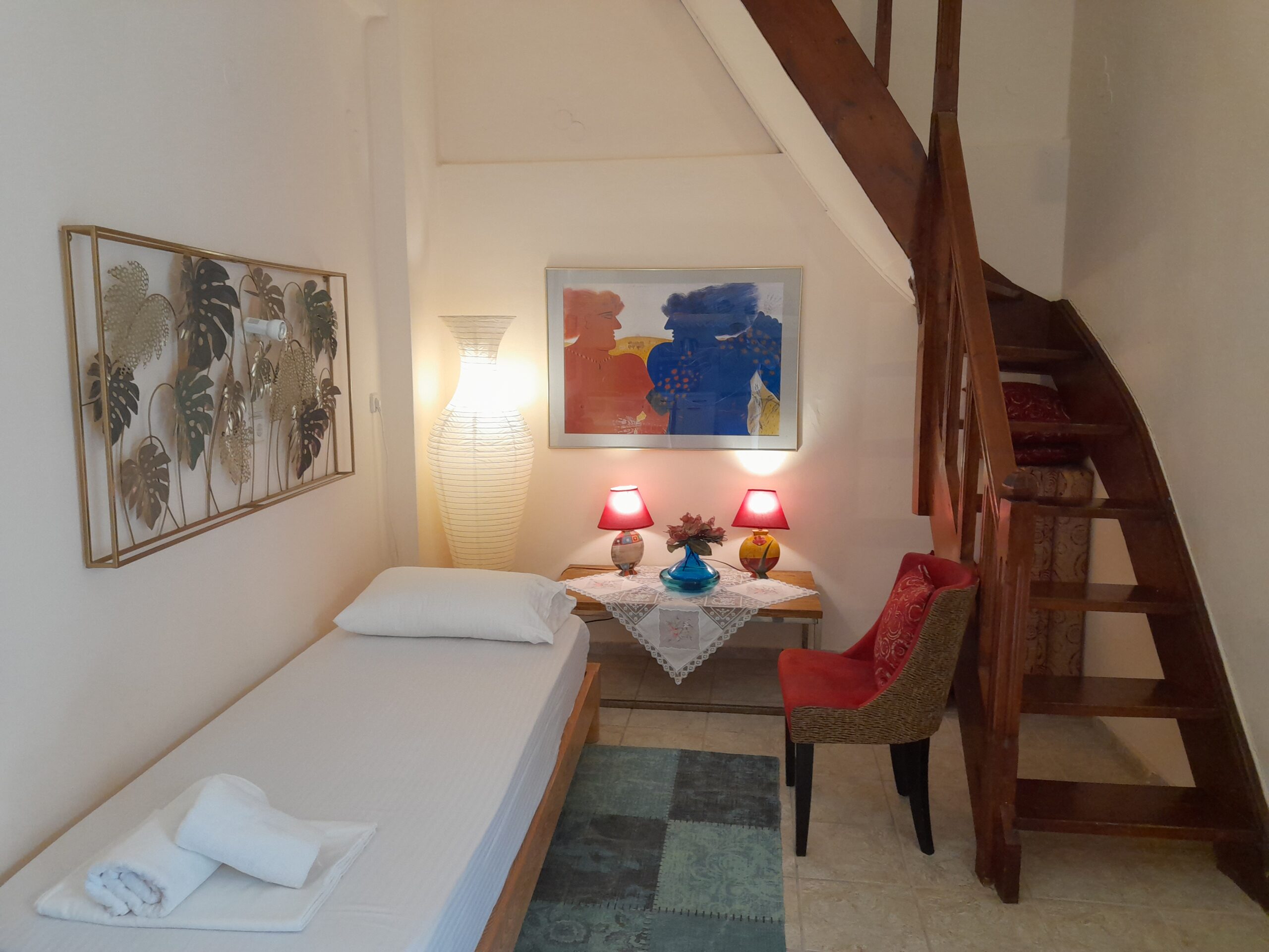 Στον επάνω όροφο υπάρχει ένα υπνοδωμάτιο με κρεβάτι queen size (158 x 200 cm), ιδιωτικό μπάνιο με ντους και μπαλκόνι με θέα στον κήπο.