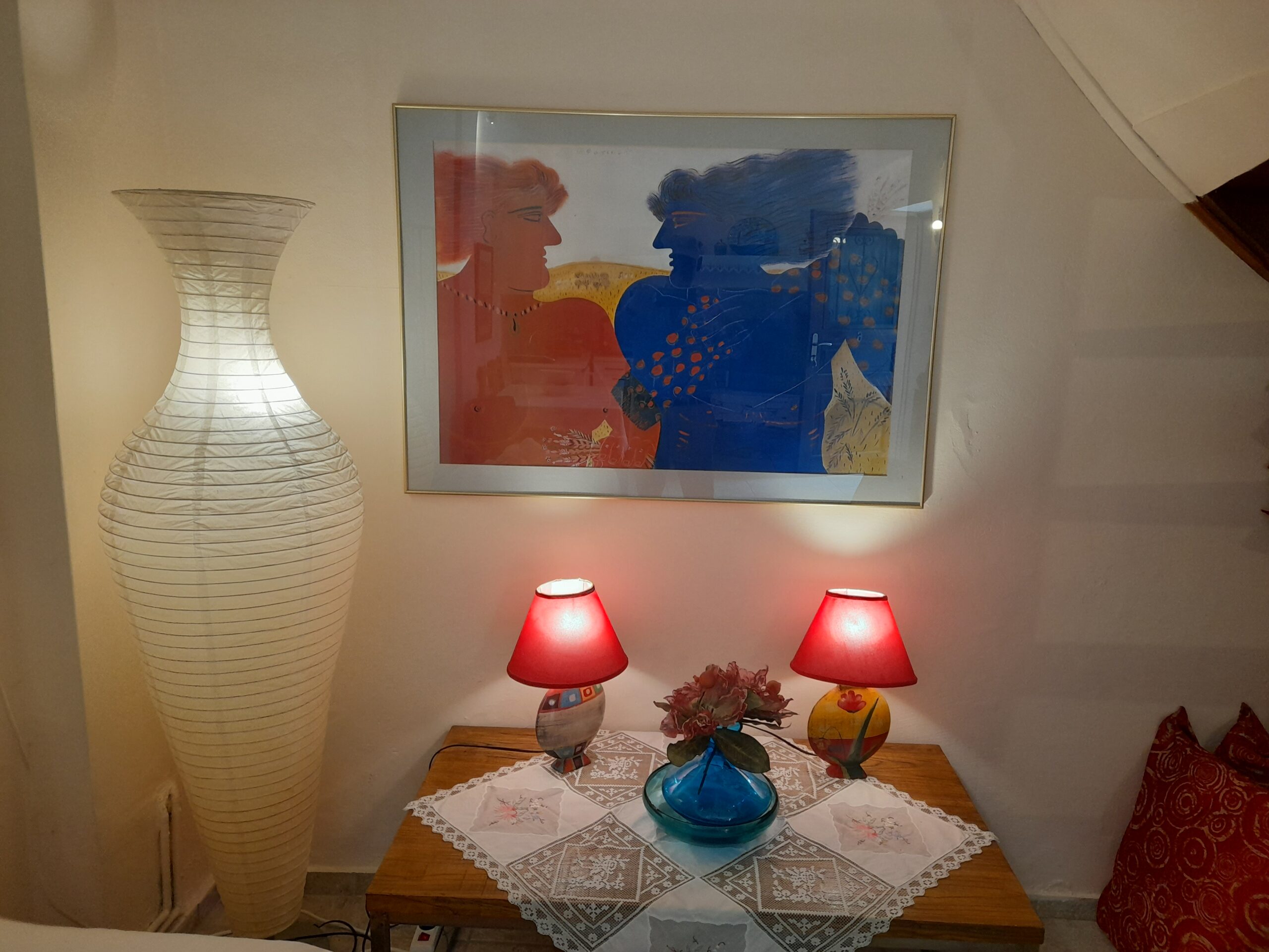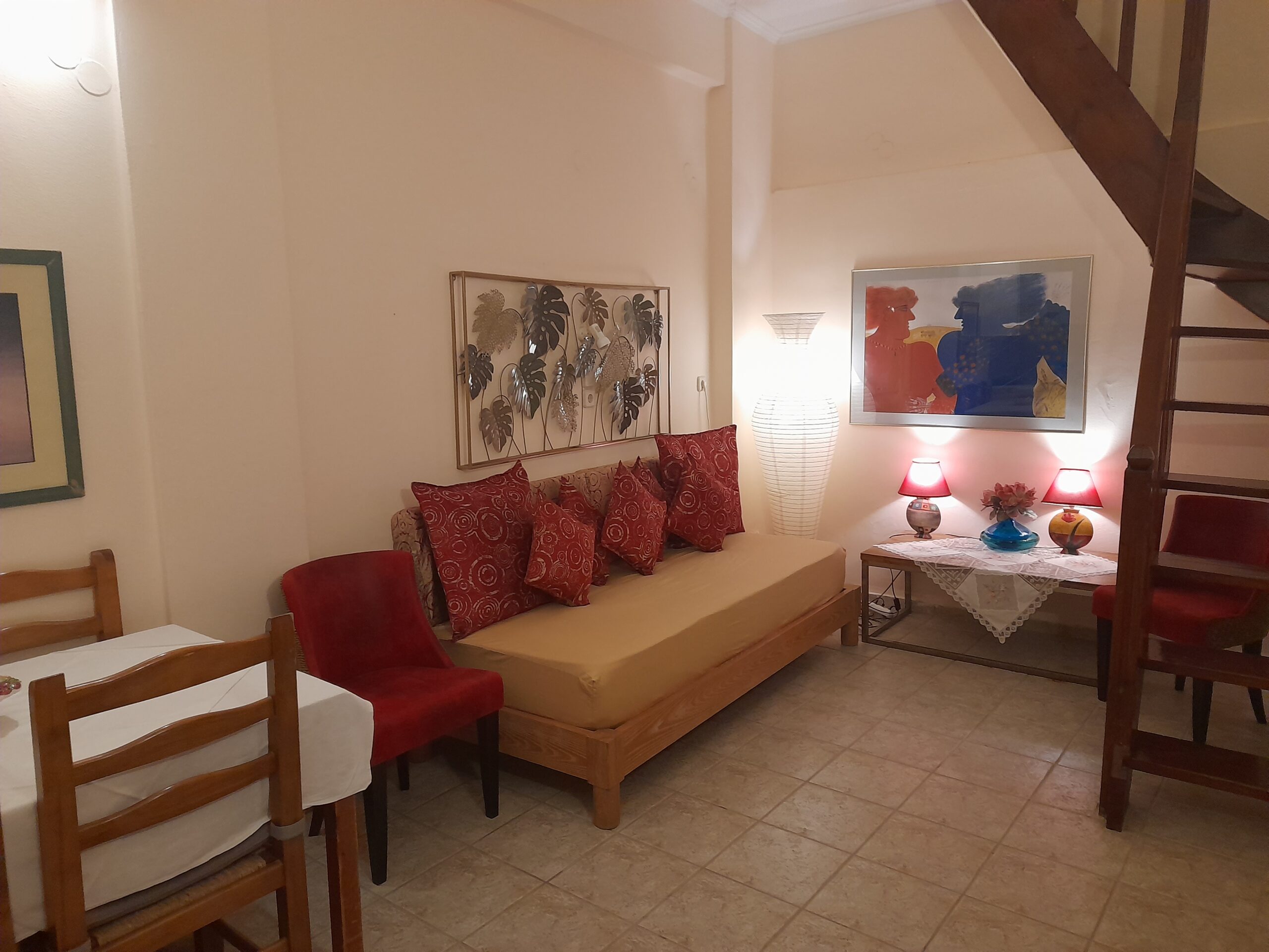 Στον κάτω όροφο μπορείτε να βρείτε ένα πολύχρωμο σαλόνι, 1 μονό καναπέ-κρεβάτι, πλήρως εξοπλισμένη κουζίνα με τραπέζι φαγητού, φούρνο και εστίες, ανεμιστήρα.