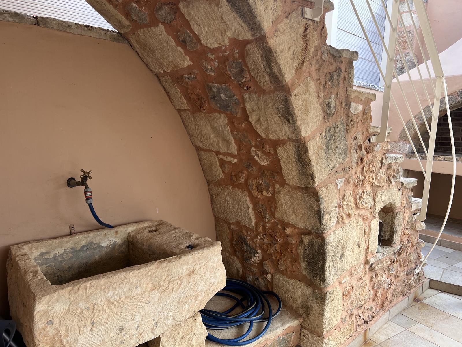 The interior design combines traditional elements, such as stone walls and arched openings, with modern aesthetic touches. Bright interiors, carefully crafted details, and characteristic blue-painted windows create a warm and elegant environment, perfectly suited for permanent residence or vacation living.