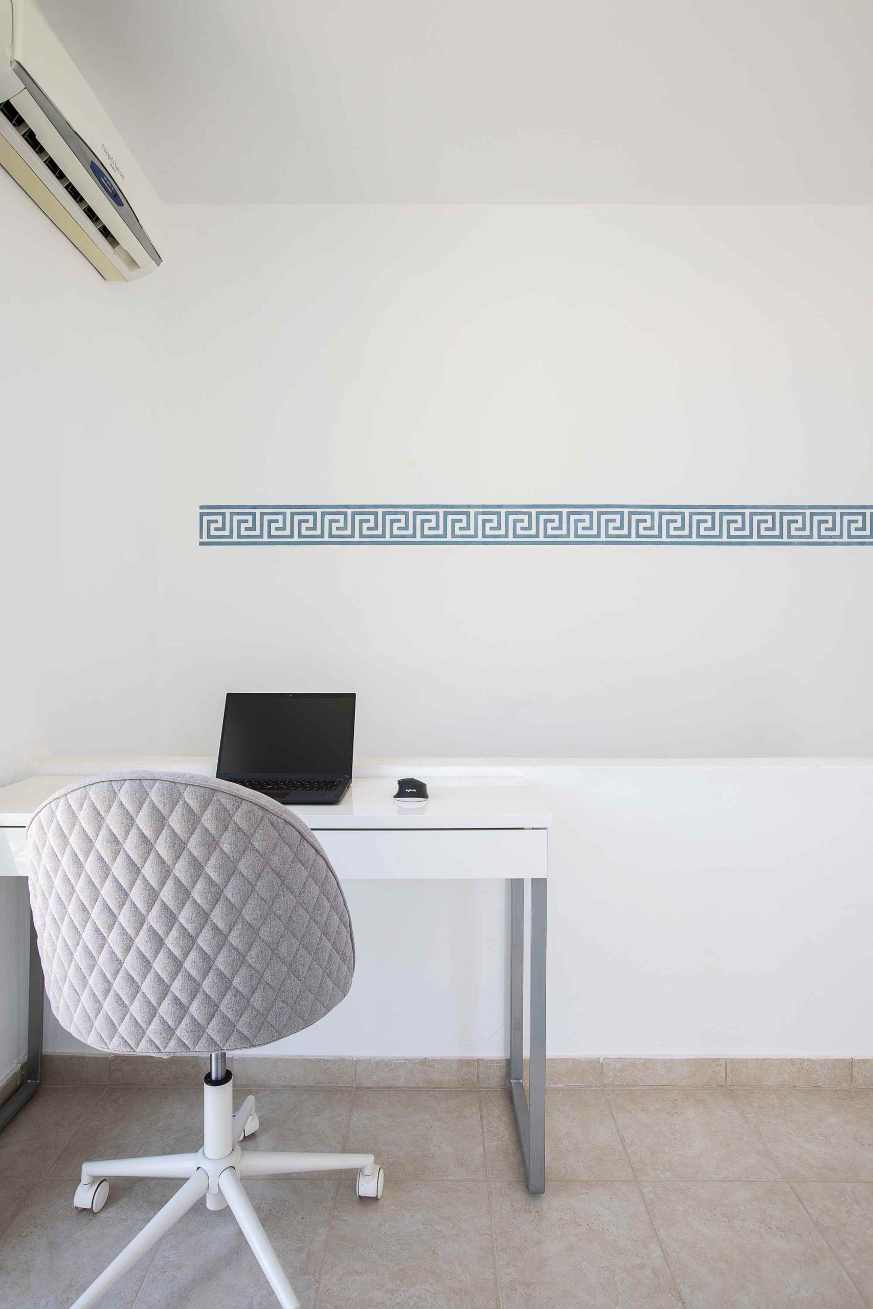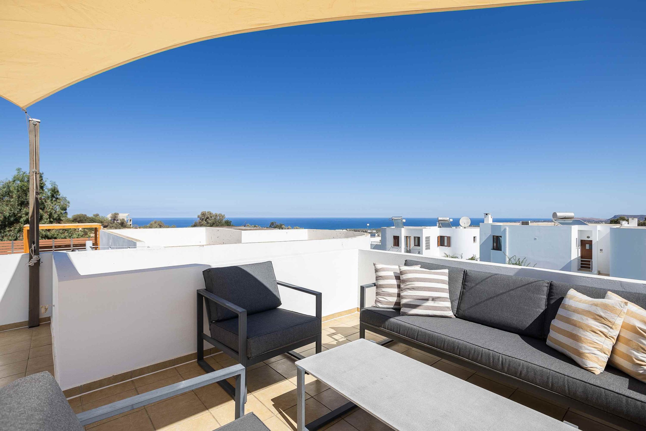 Upstairs, the second level features a generous master bedroom, a bathroom, and access to a large balcony. From here, an external spiral staircase leads up to the private rooftop terrace – an ideal spot to unwind and enjoy the panoramic sea views and the peaceful atmosphere of the surroundings.