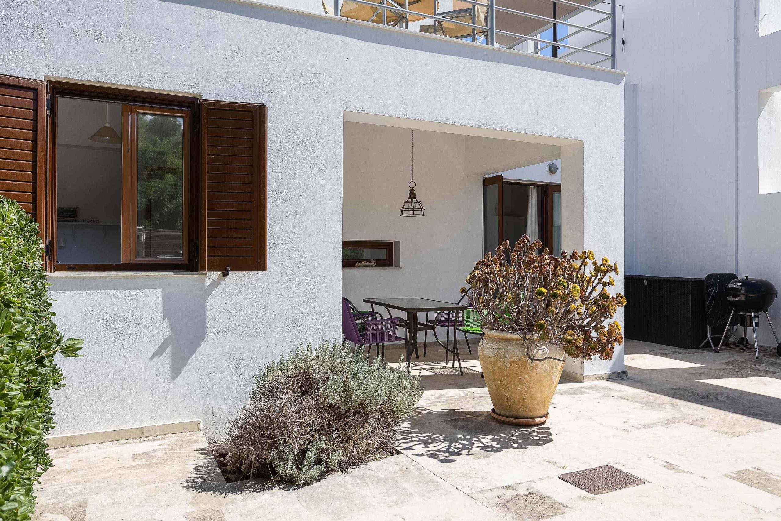 The ground floor features an open-plan kitchen and living area, offering direct access to a spacious private courtyard, ideal for outdoor dining and relaxation. On the same level, there are two bedrooms, a bathroom, and a convenient storage space beneath the internal staircase. The courtyard at the rear side of the property provides privacy while also offering direct access to the swimming pool surrounded by lush gardens.