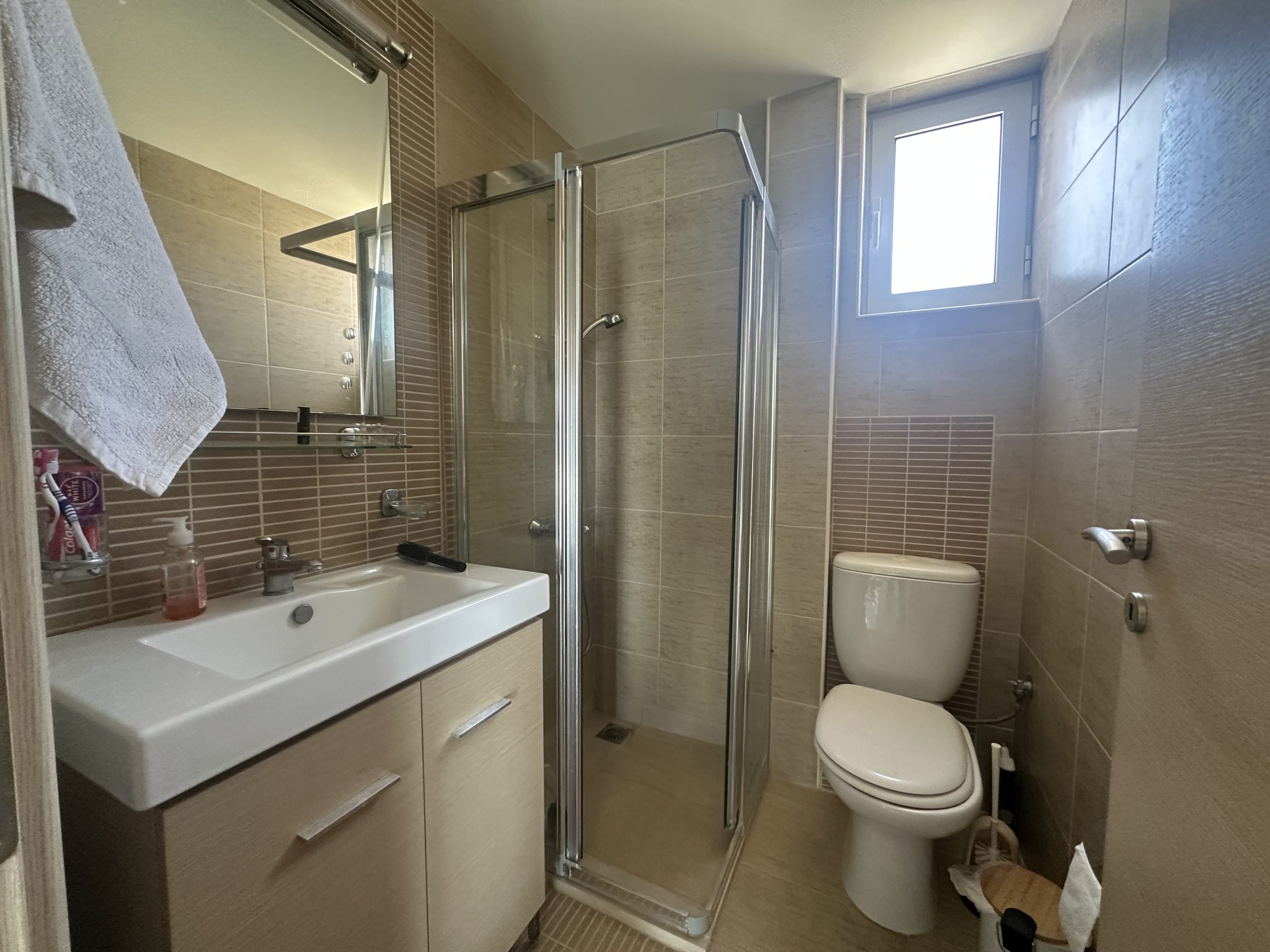 The apartment comprises two well-appointed bedrooms, a modern bathroom, and an open-plan kitchen, dining, and living area that flows seamlessly onto a generous covered balcony. From here, you can enjoy relaxing views of the inviting swimming pool, and of the sea. The balcony is perfect for outdoor dining, lounging, or simply soaking in the warm Mediterranean atmosphere.