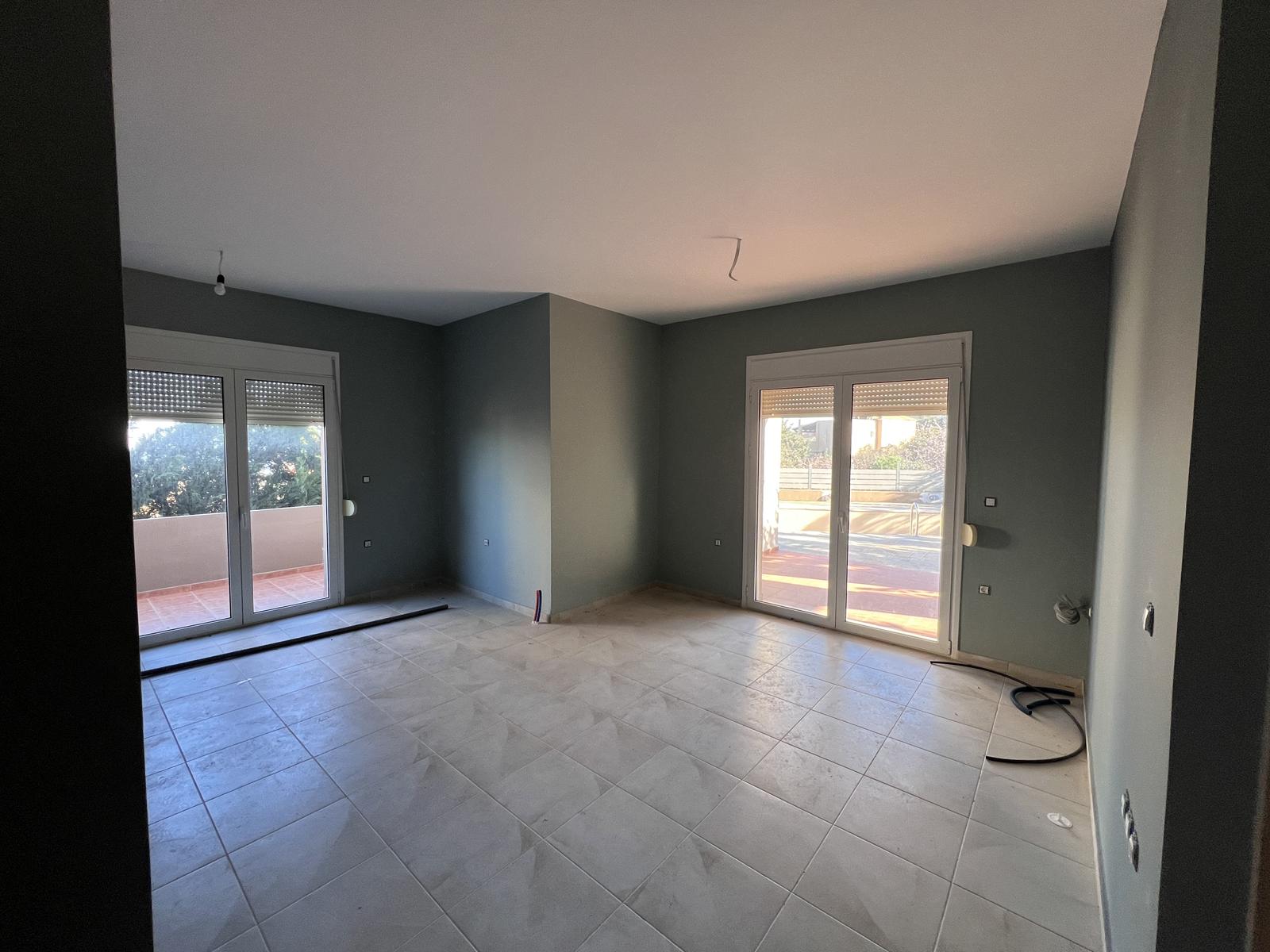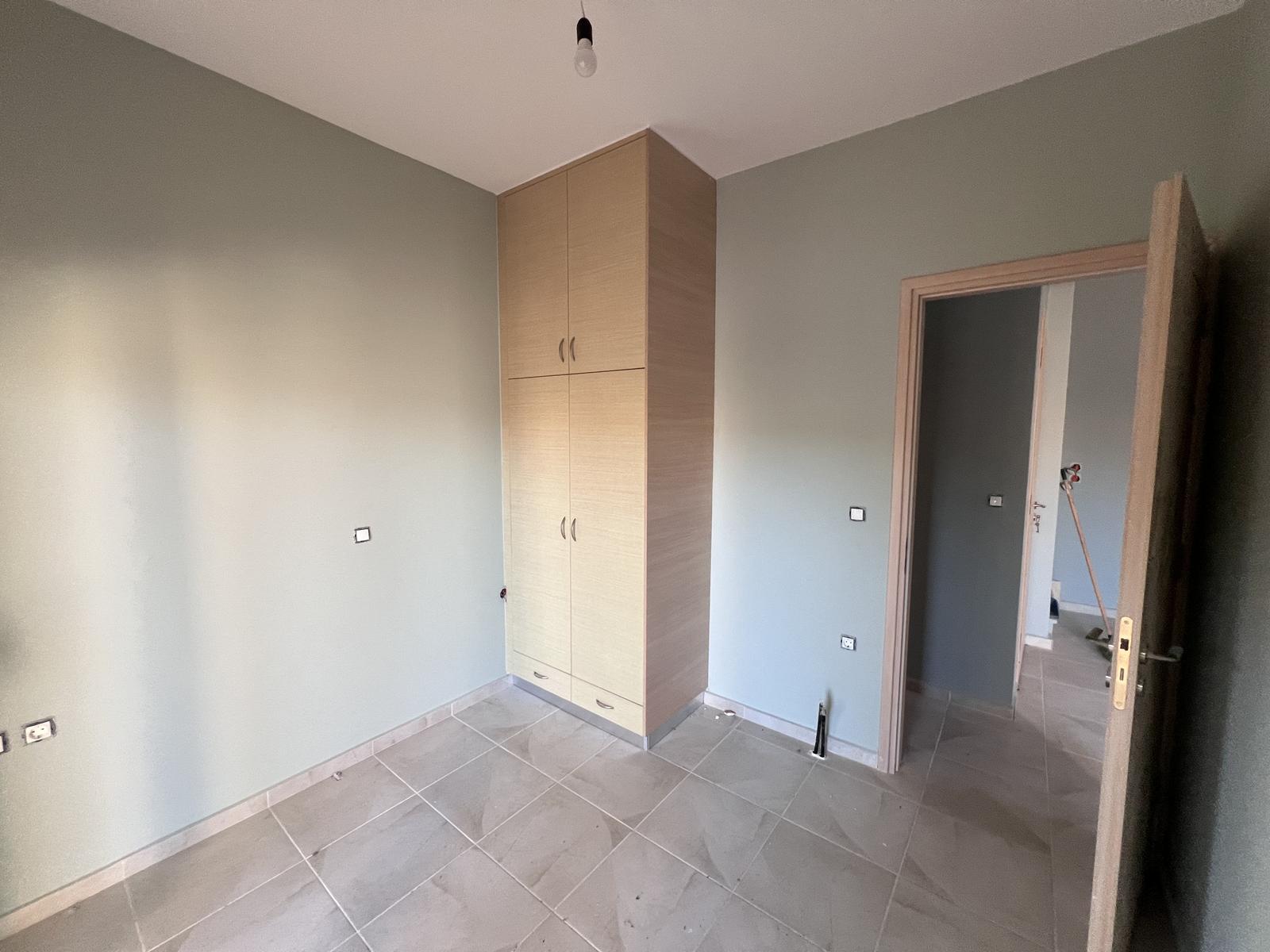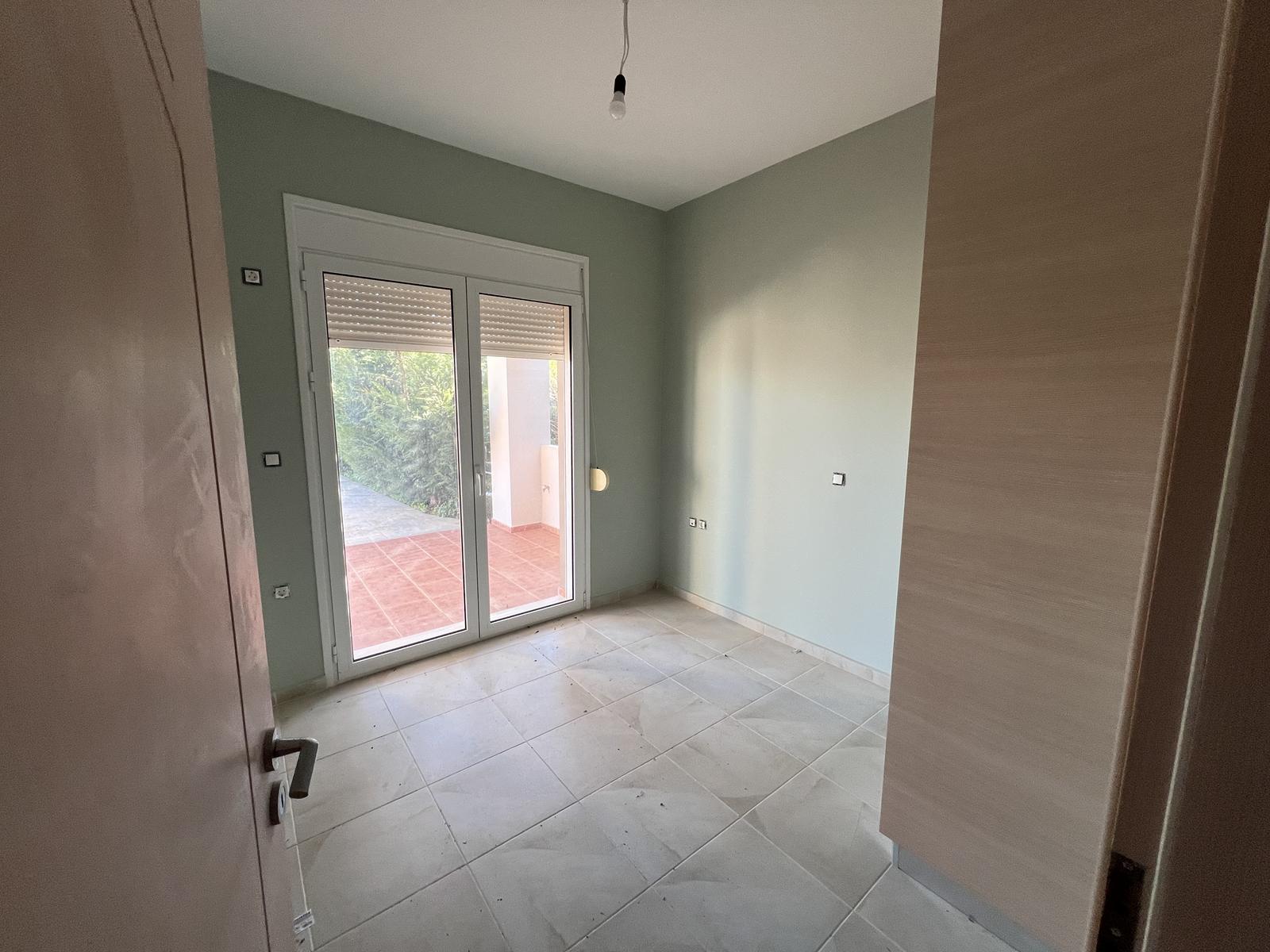 The upper floor consists of two additional bedrooms and one bathroom, all benefiting from natural light and open views. The house is equipped with air-conditioning units in all rooms and aluminum window frames, ensuring year-round comfort.