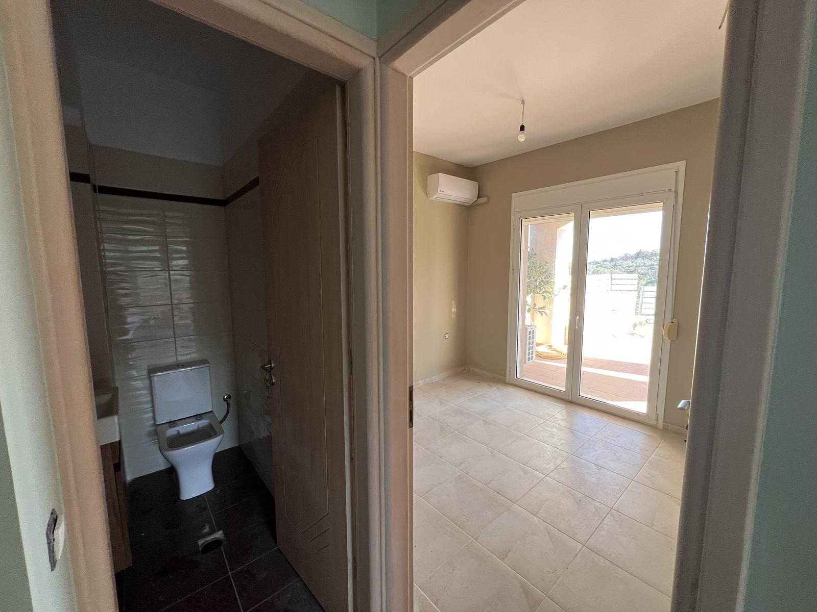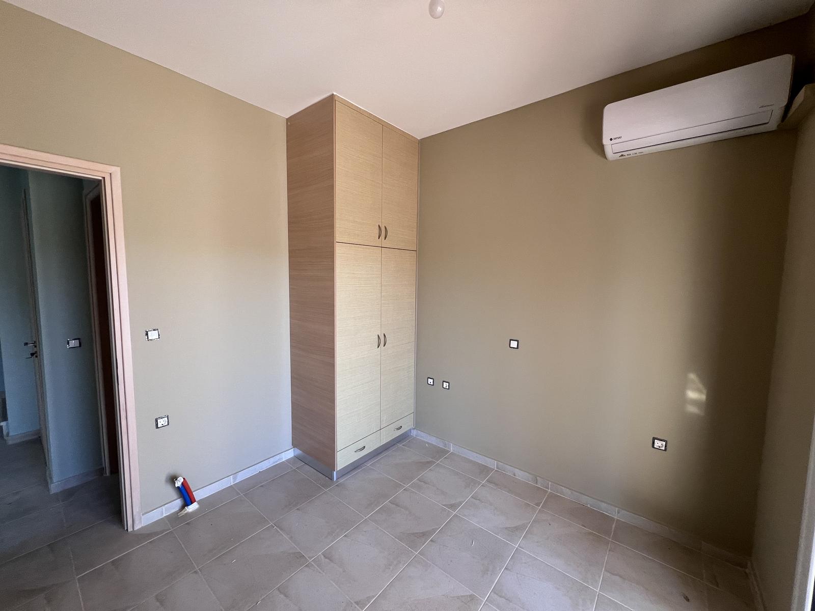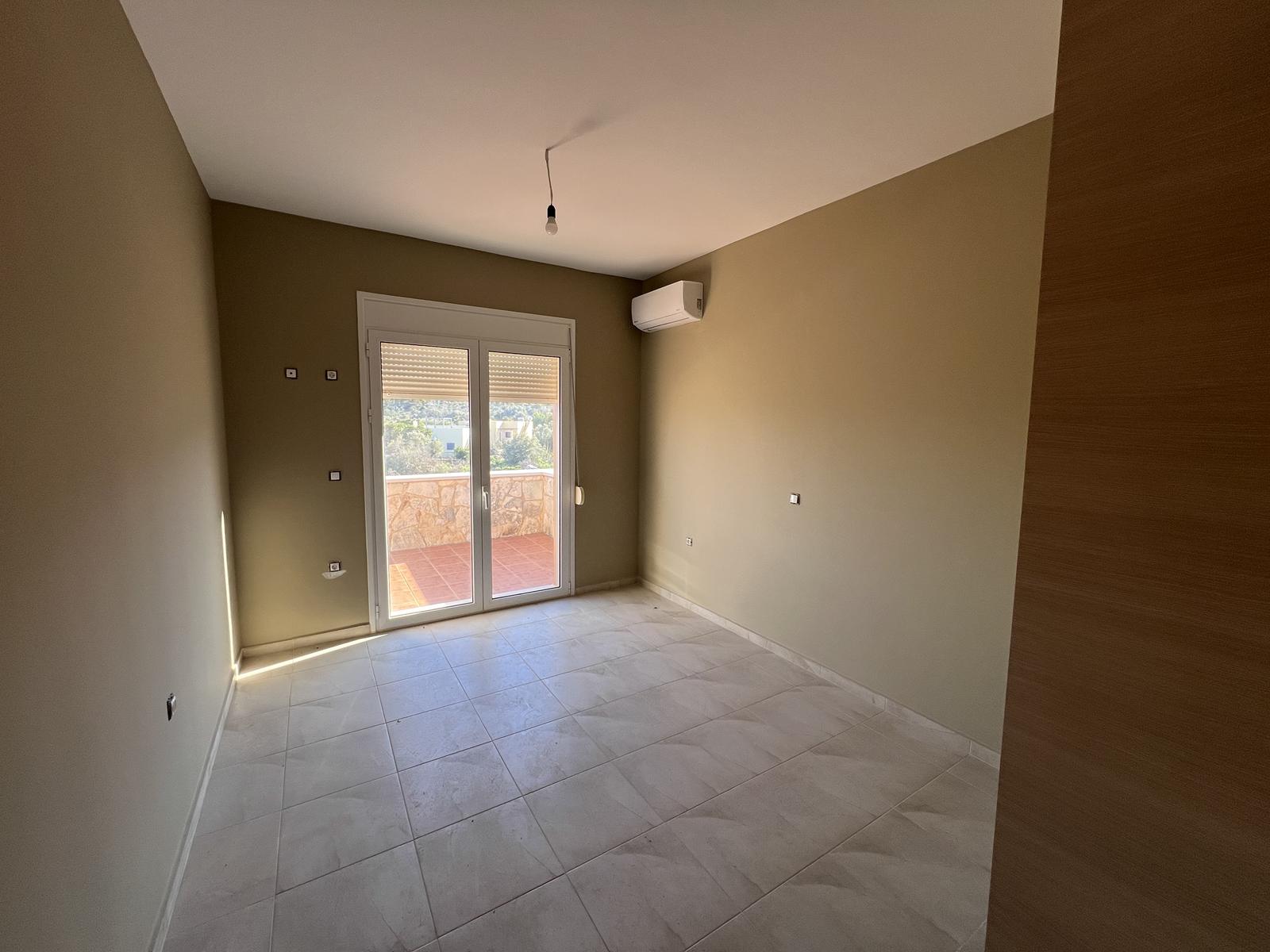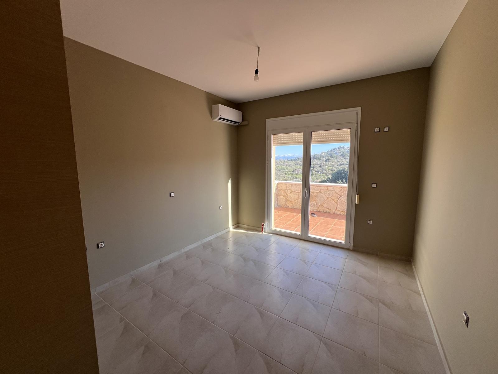 The upper floor consists of two additional bedrooms and one bathroom, all enjoying natural light and open views. The house is equipped with air-conditioning units in all rooms and aluminum window frames, ensuring year-round comfort.