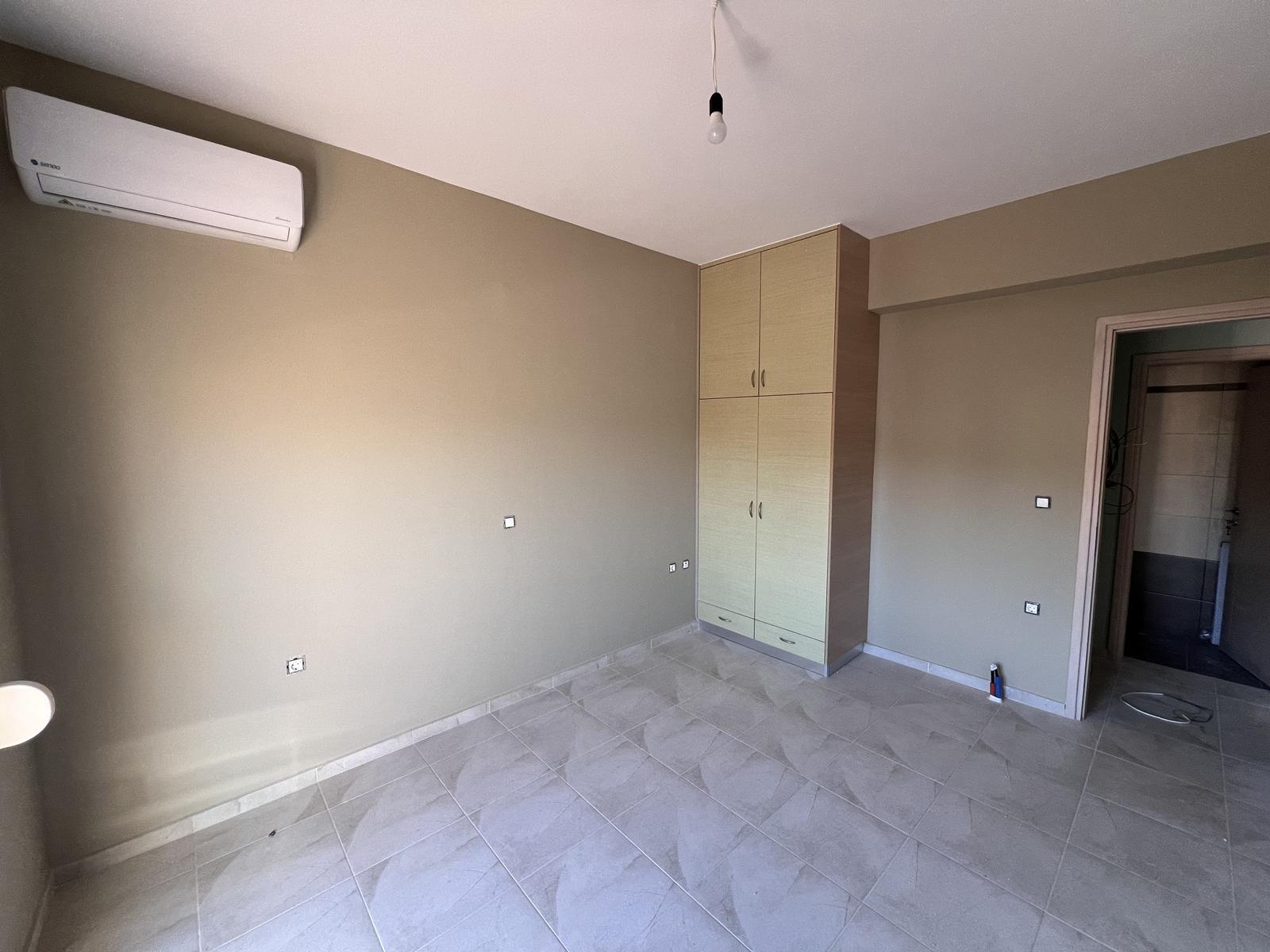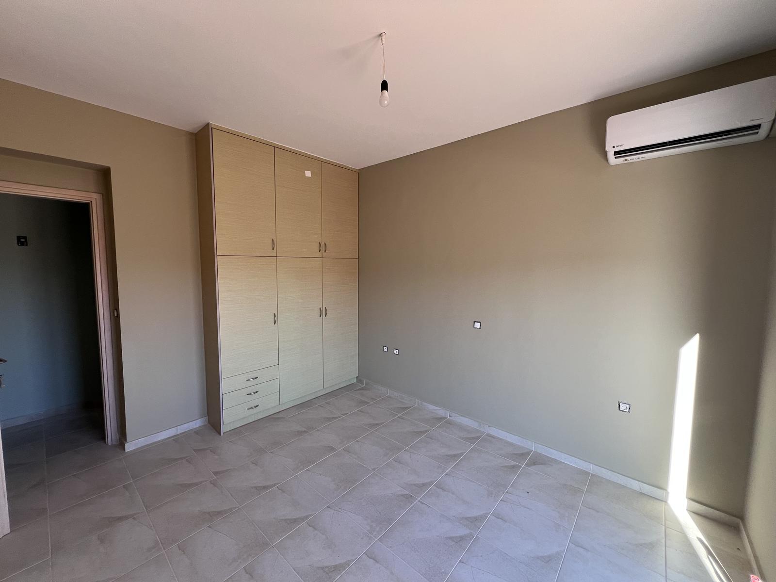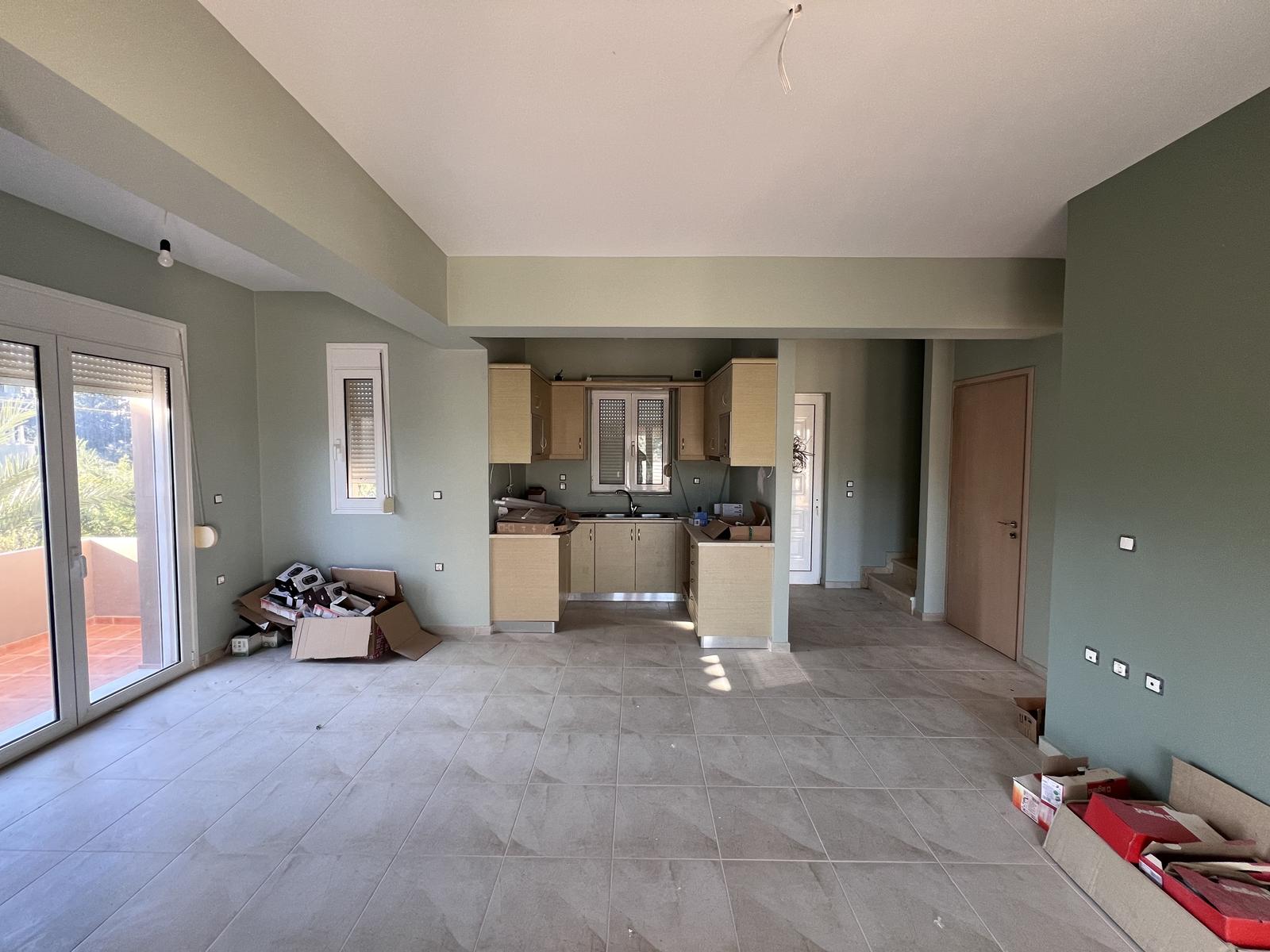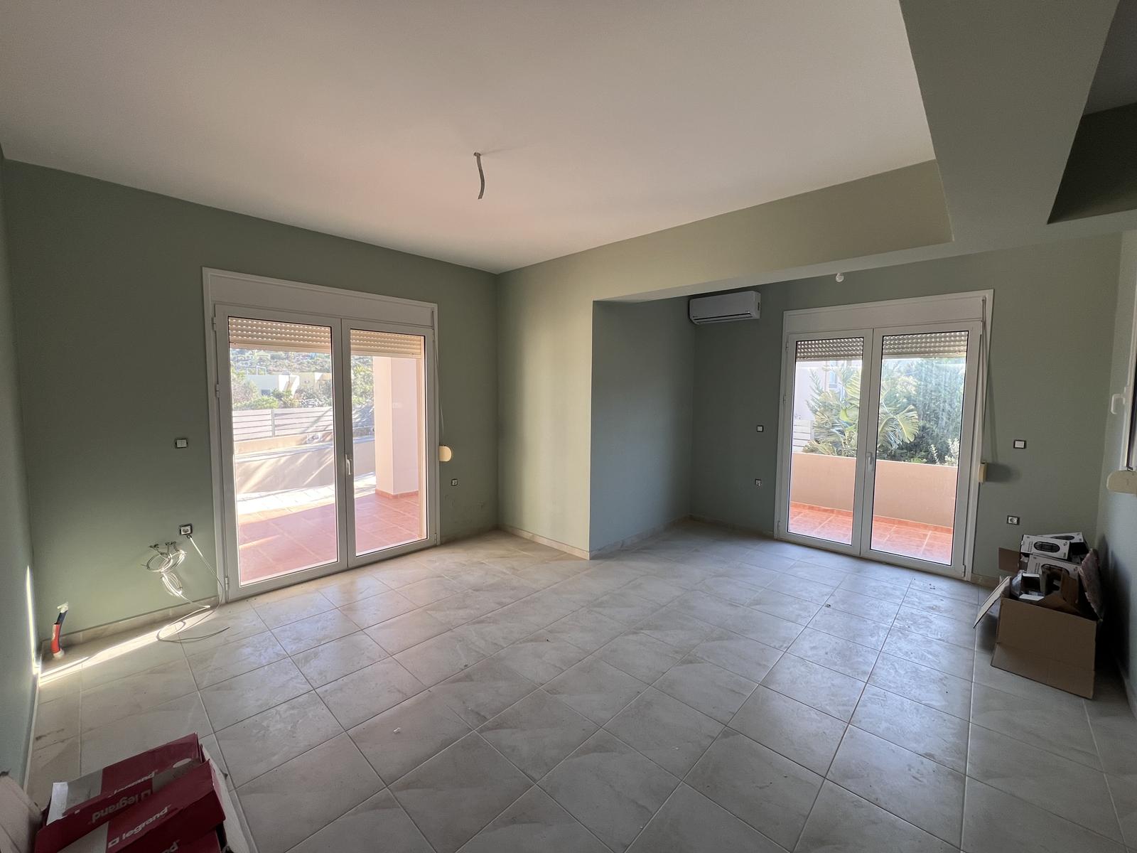 The upper floor consists of two additional bedrooms and one bathroom, all enjoying natural light and open views. The house is equipped with air-conditioning units in all rooms and aluminum window frames, ensuring year-round comfort.