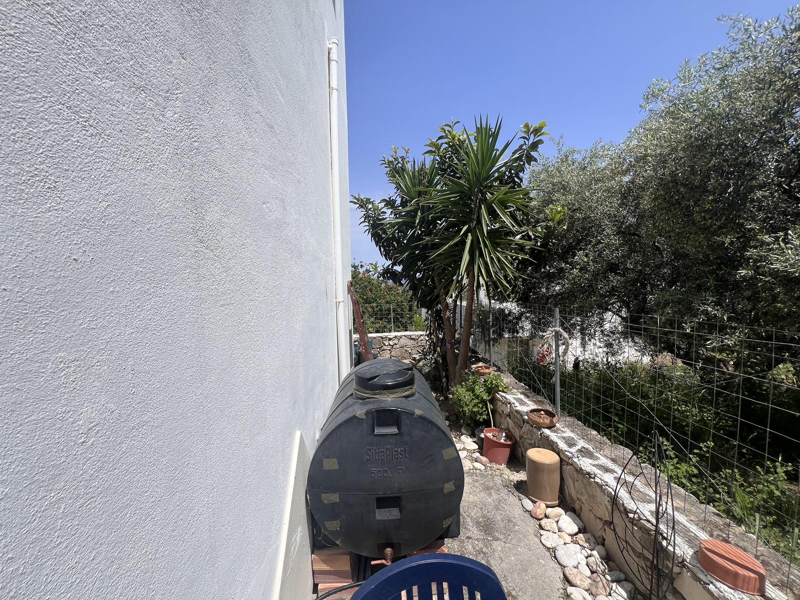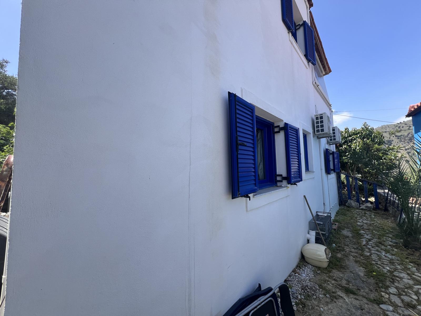 The house features traditional architectural elements with a tiled roof, whitewashed walls, and blue shutters, blending harmoniously into the surrounding landscape. The spaces are bright and functional, and the standout feature remains the breathtaking view over both the lake and the sea.