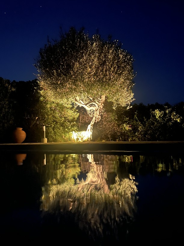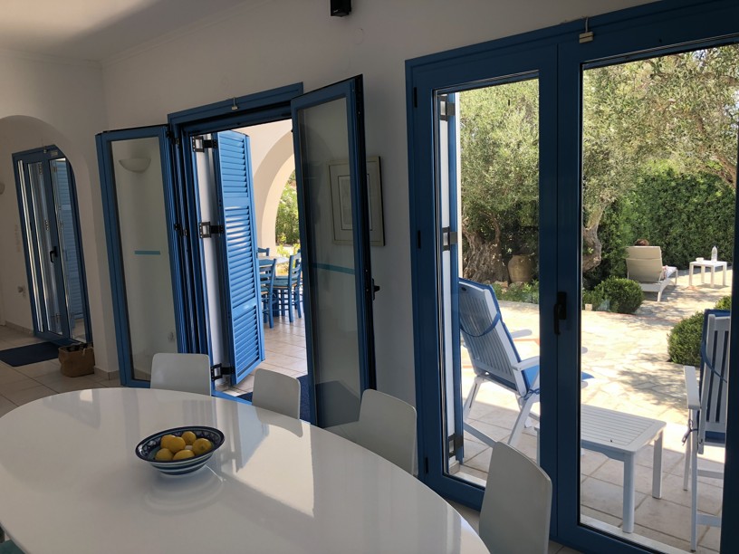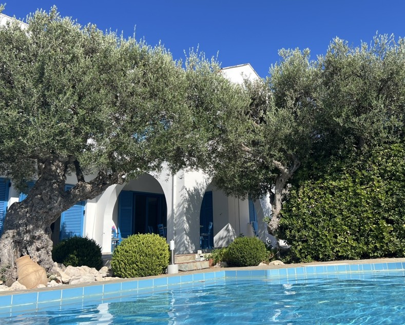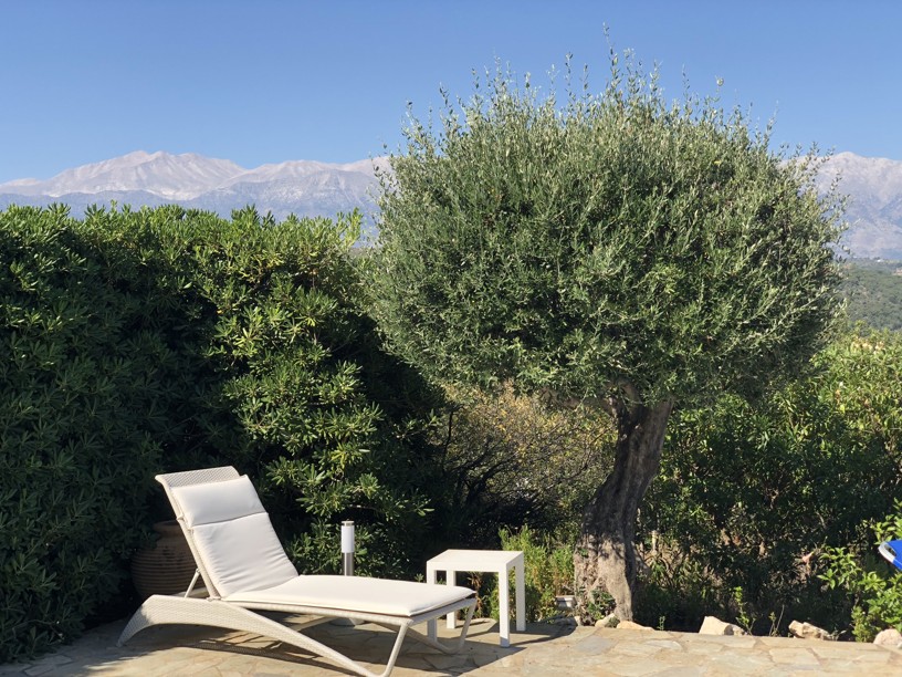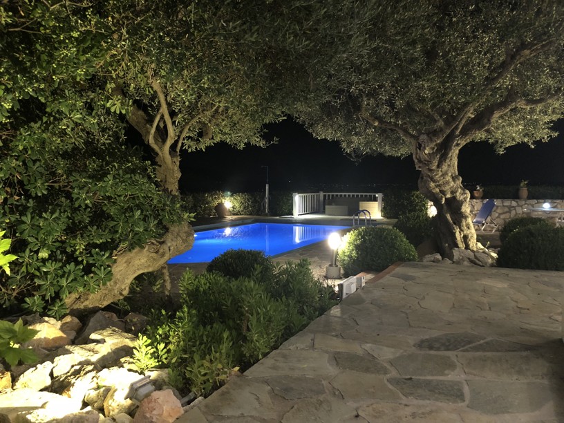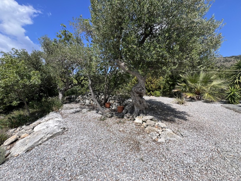 The swimming pool with outdoor shower, sunbathing terraces, covered dining area and outdoor kitchen enjoying the sea and mountain views provides the perfect entertainment area, but around the landscaped gardens with fruit trees, flowering shrubs, bushes and mature plants ( with irrigation system) you will find any number of areas for quiet contemplation, in the sun or shade as well as the olive grove which produces oil for the villa.