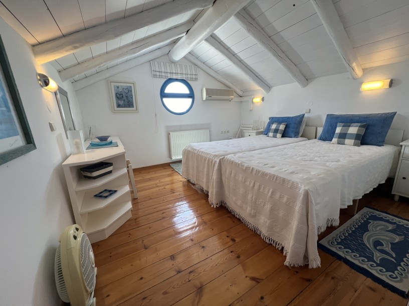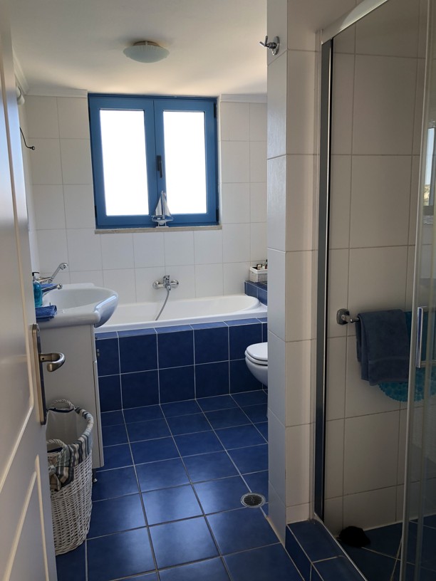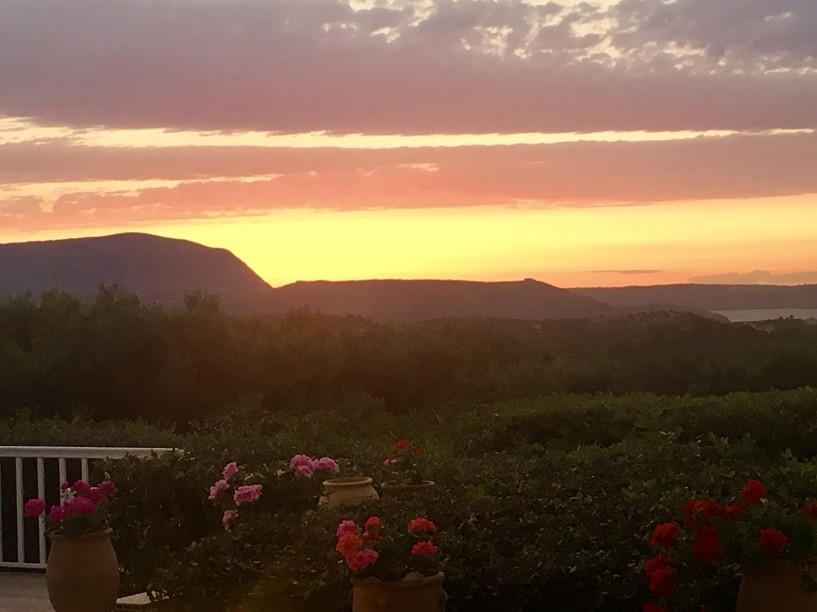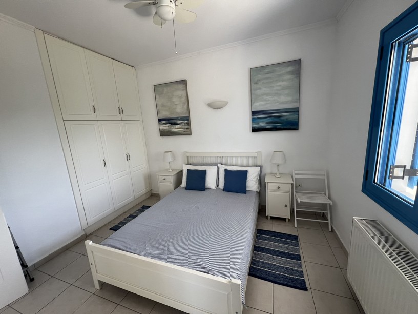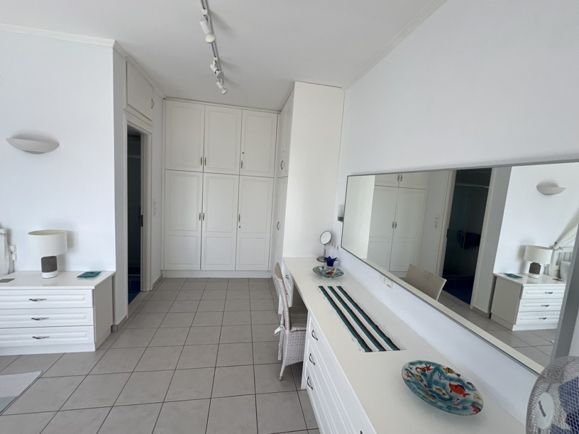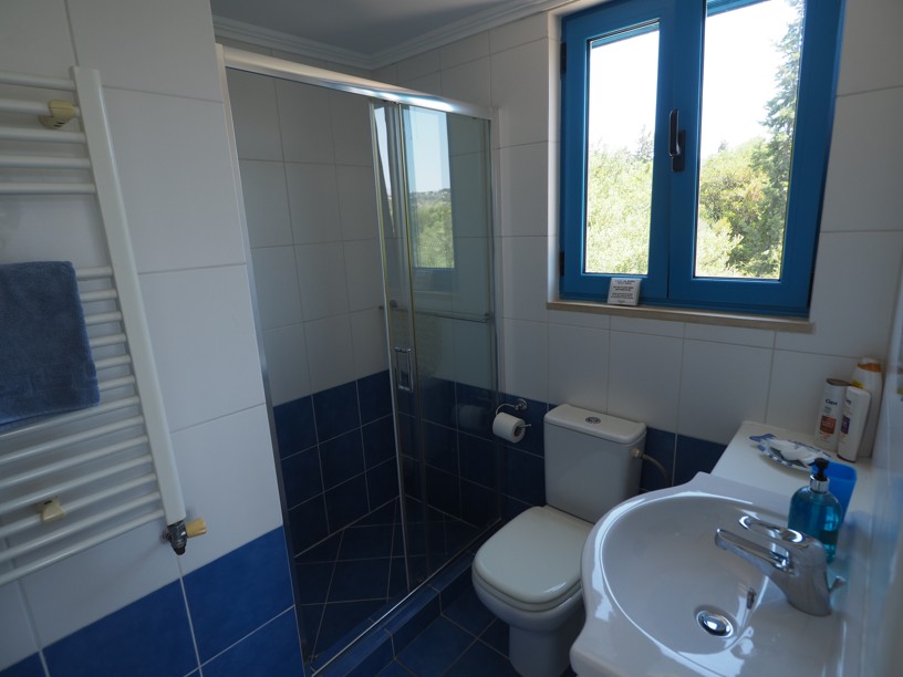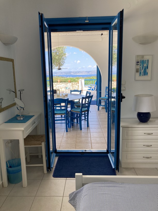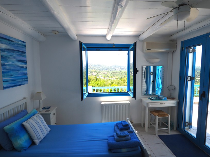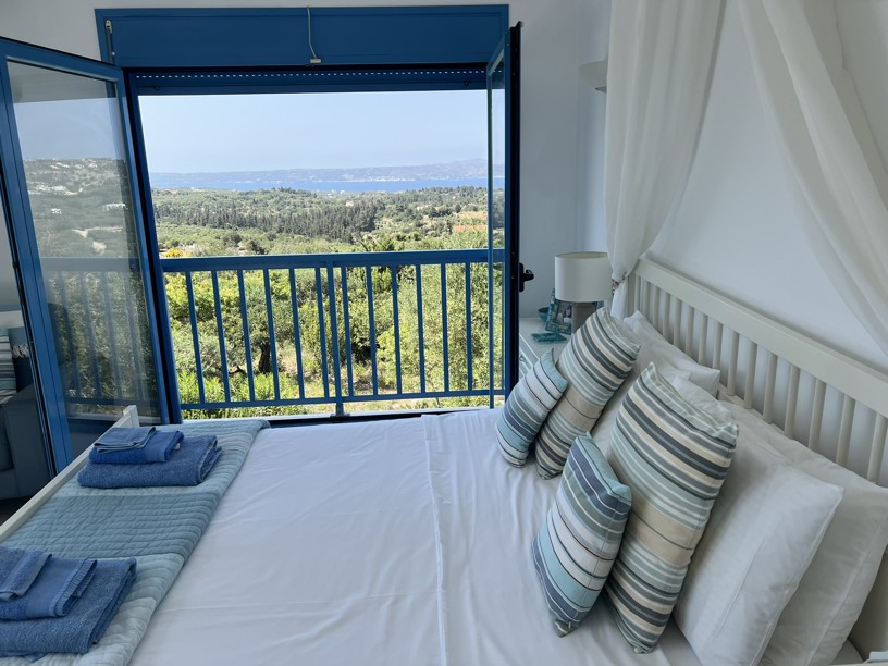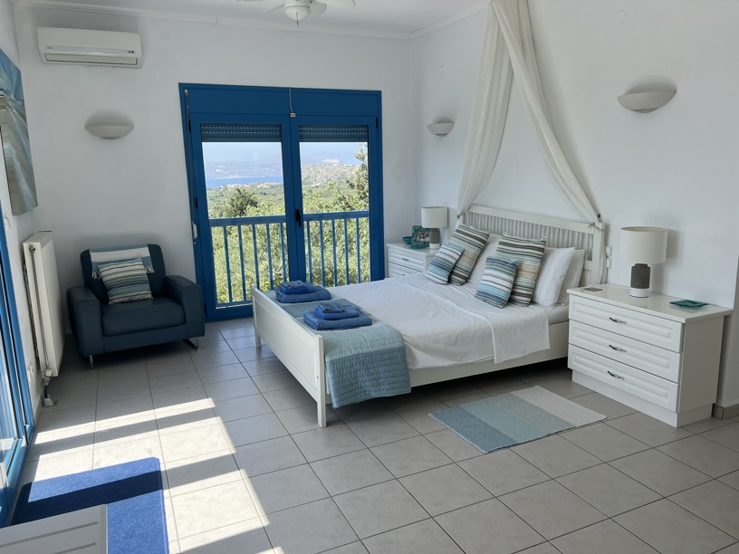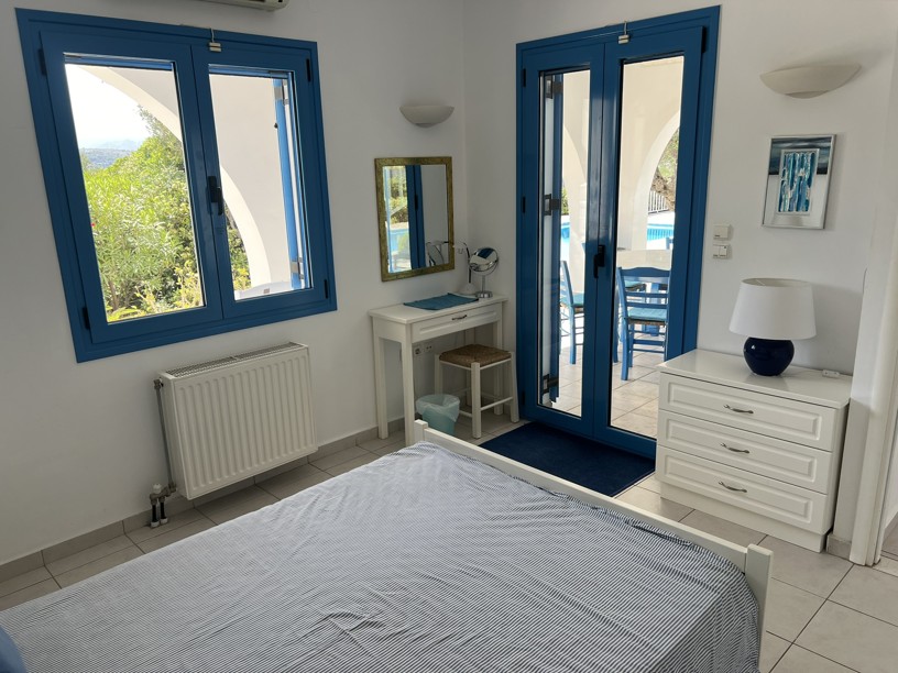 The master bedroom has a dressing area and with two sets of patio doors opening to the right ( sea views) and directly ahead ( mountain views), you can enjoy both the sunrise and sunset from your bed! Steps from the balcony lead down to the garden.