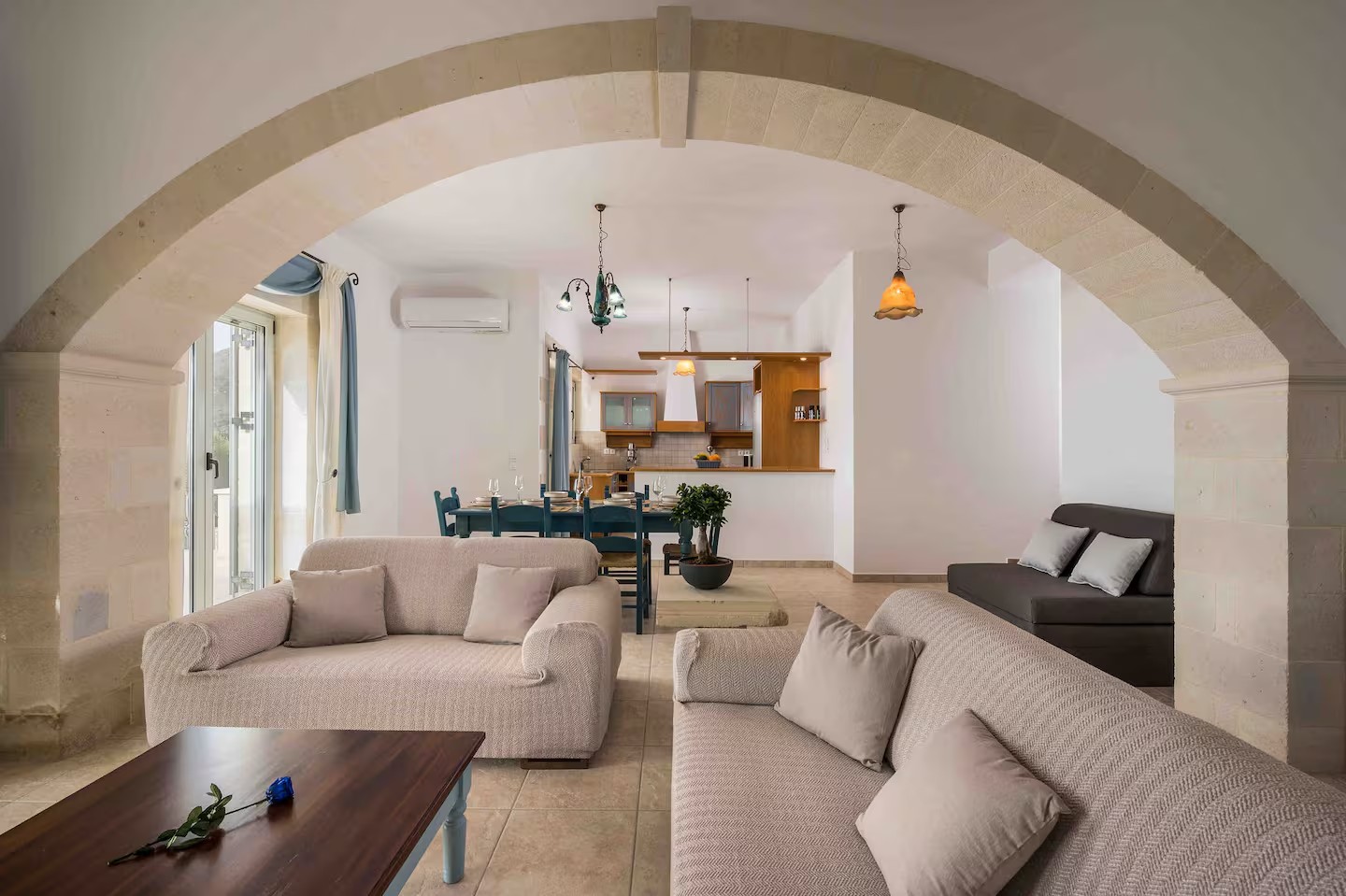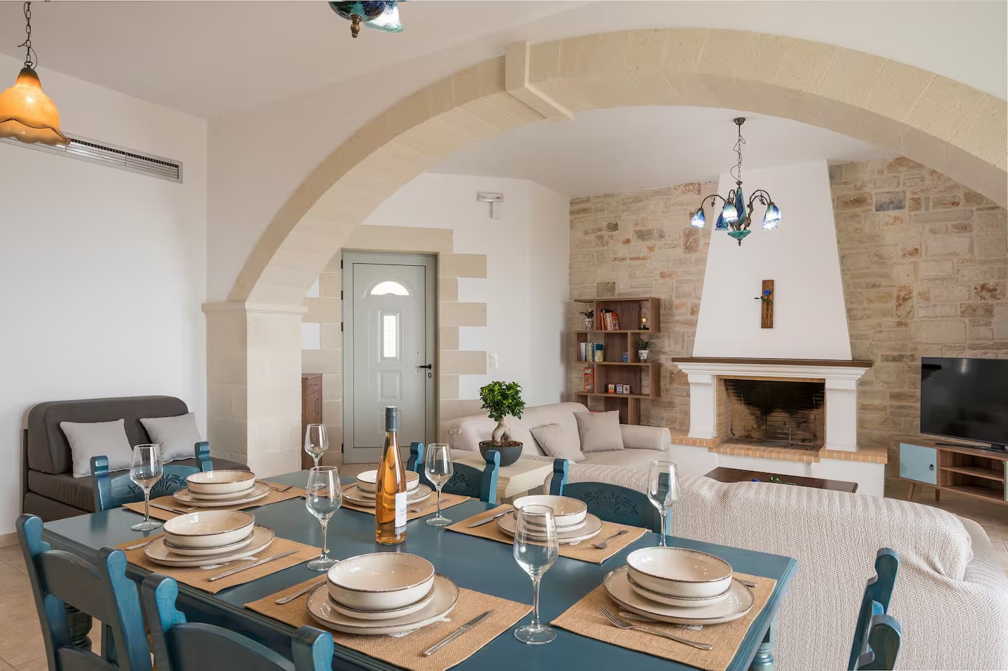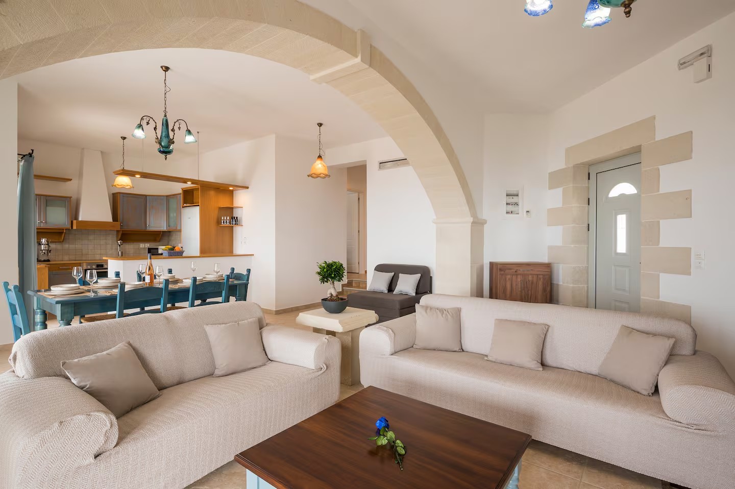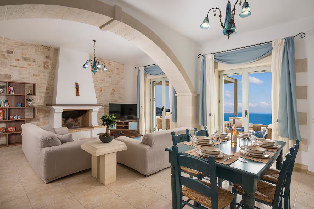 Wejście prowadzi bezpośrednio do przestronnego salonu typu open space. Charakterystyczny kamienny łuk oddziela w pełni wyposażoną kuchnię i jadalnię z kominkiem od części wypoczynkowej. Dwa zestawy przeszklonych drzwi tarasowych otwierają się na imponujący, zadaszony balkon o powierzchni 39 m², z którego roztacza się spektakularny widok na morze, niebo oraz półwysep Akrotiri. Przestrzeń ta oferuje wiele możliwości relaksu i życia na świeżym powietrzu.