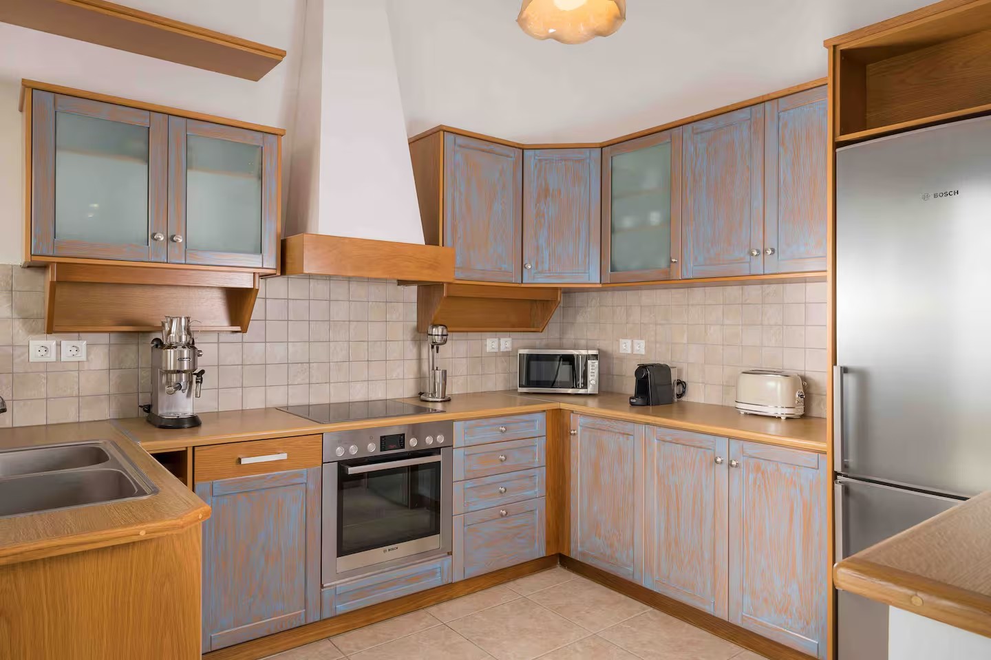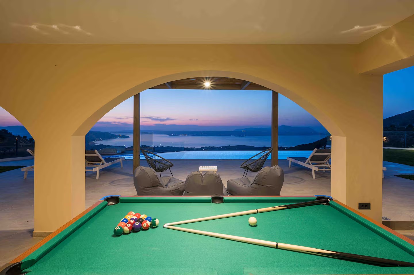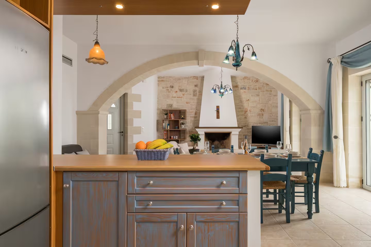 Wejście prowadzi bezpośrednio do przestronnego salonu typu open space. Charakterystyczny kamienny łuk oddziela w pełni wyposażoną kuchnię i jadalnię z kominkiem od części wypoczynkowej. Dwa zestawy przeszklonych drzwi tarasowych otwierają się na imponujący, zadaszony balkon o powierzchni 39 m², z którego roztacza się spektakularny widok na morze, niebo oraz półwysep Akrotiri. Przestrzeń ta oferuje wiele możliwości relaksu i życia na świeżym powietrzu.