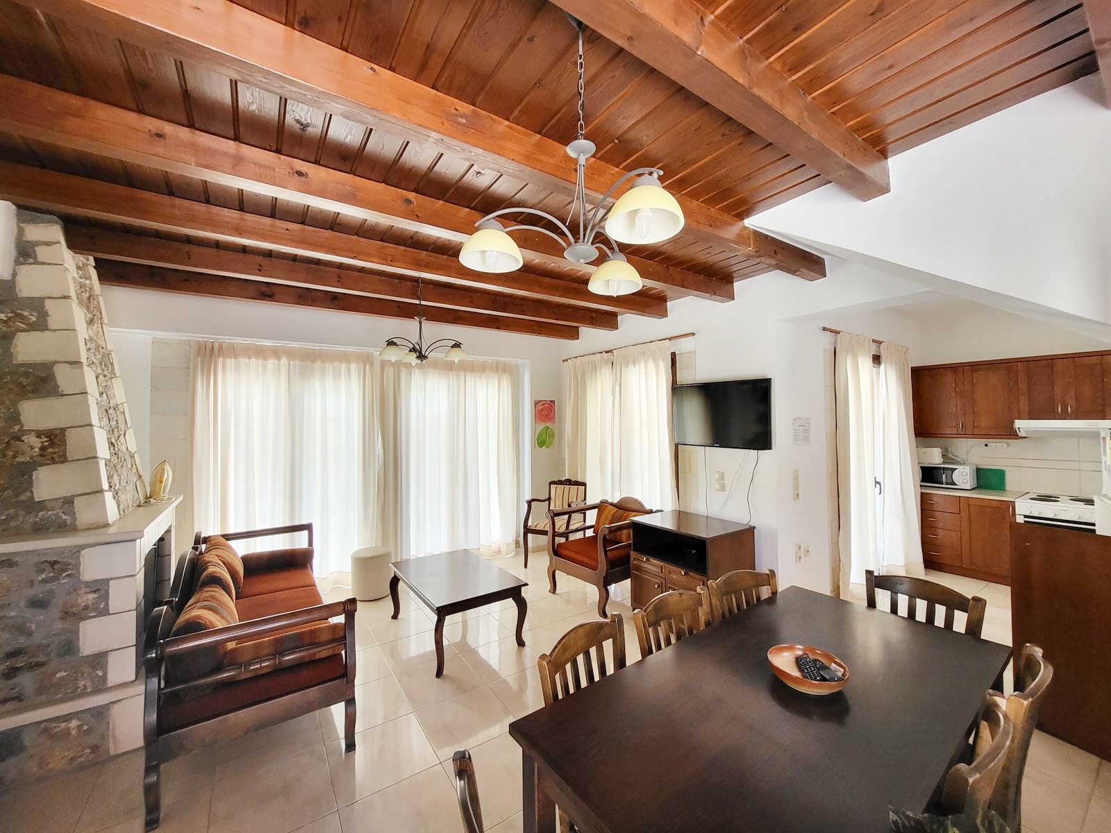 Salon oferuje przytulny kominek, wygodne sofy, część jadalną oraz wyjście na taras.