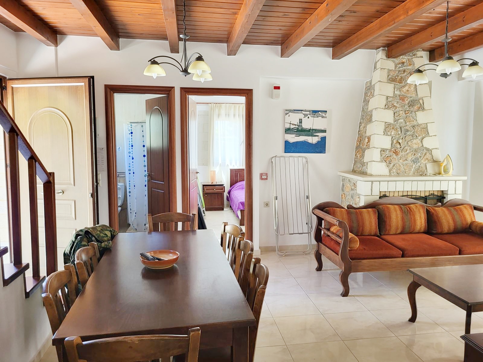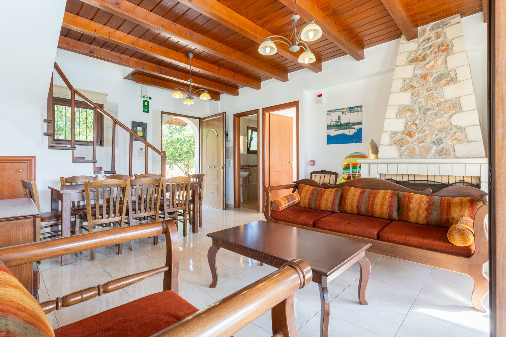 Salon oferuje kominek, wygodne sofy, część jadalną oraz wyjście na taras.